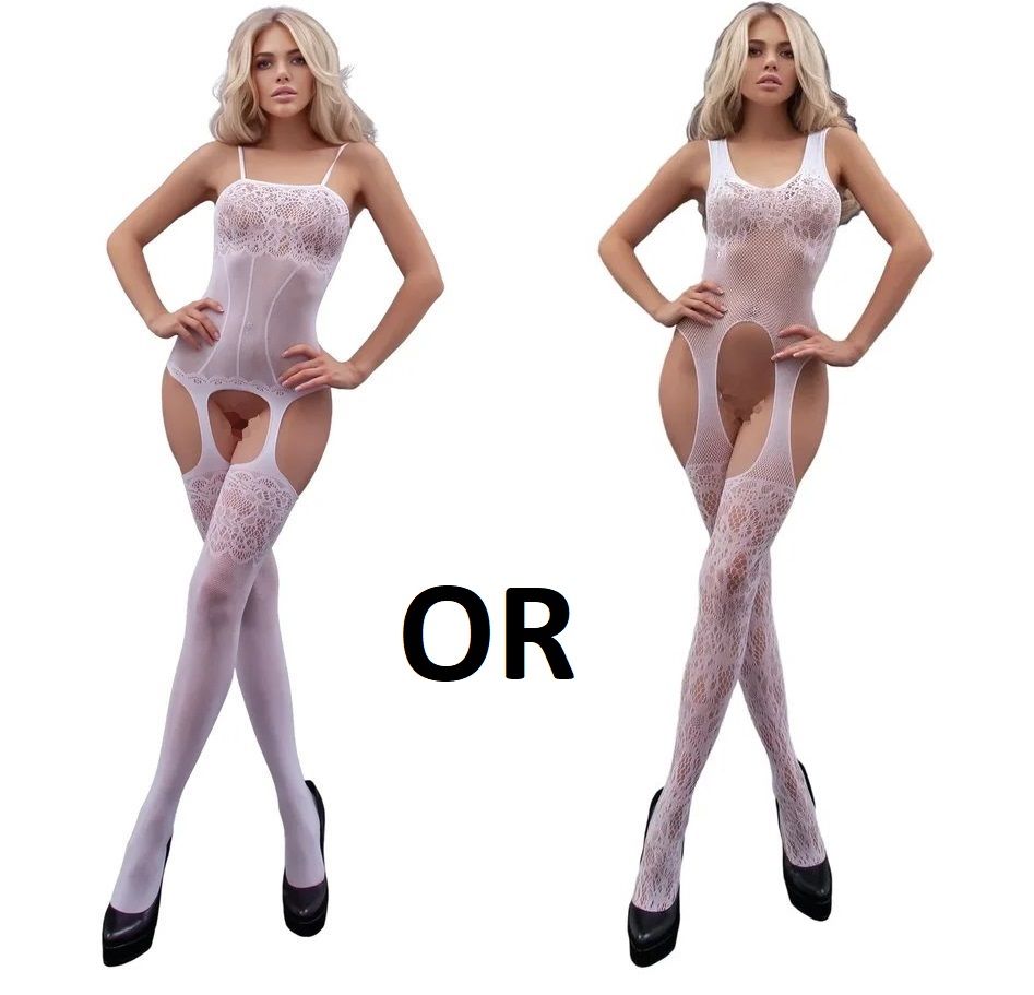 Свадебный набор нижнего эротического белья, в который входят: белоснежный кэтсьюит с доступом, чулки, комплект-бикини на завязках. В комплекте: чулки (артикул AME304), комбинезон (AME008 ИЛИ AME003), комплект из трусиков и лифа (AME3014).