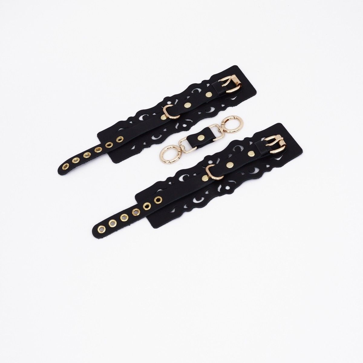 Наручники с узорным дизайном из натуральной кожи с золотистой фурнитурой. Резные элементы придают атмосферу нежности, элегантности и подчеркивают красоту тела. Регулируются ремешком, а также в комплекте прочный соединитель с двумя карабинами. Доставляется в фирменной упаковке в виде брендированной деревянной подложки. Длина манжеты - 18,5 см. Ширина манжеты - 7 см. Обхват - 19-27 см.