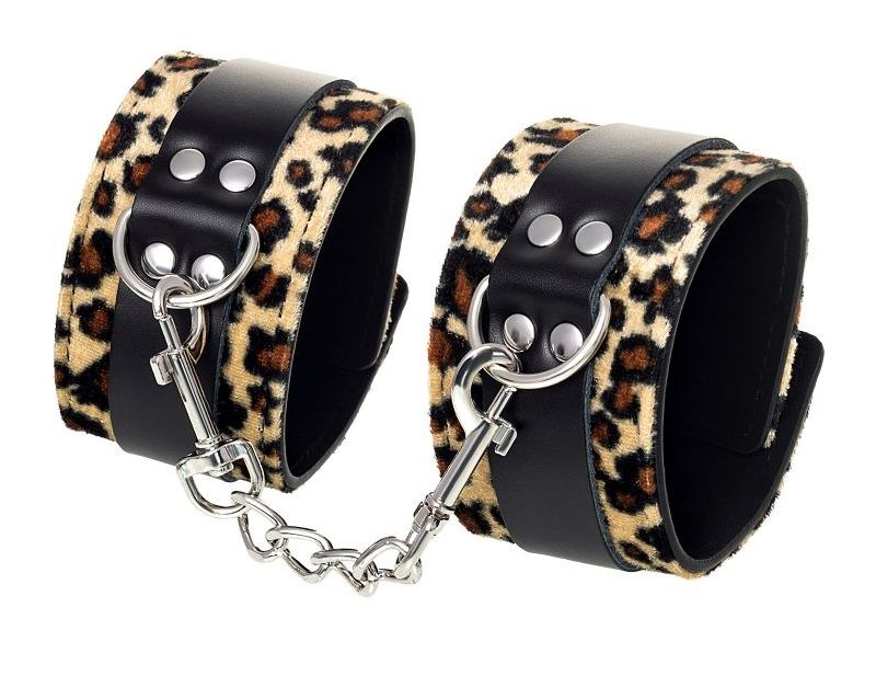 Изготавливаются из кожи с велюровой подкладкой. При изготовлении использована фурнитура с никелевым покрытием. Между слоем основы и подкладкой проложена мягкая прокладка. Соединяются между собой коротким ремешком с двумя карабинами на концах. Не нарушают кровообращение, надёжно фиксируются на щиколотках. Эти яркие оковы с леопардовым принтом сделают подчиненного неотразимым. Леопардовый окрас демонстрирует агрессивный вид. Все звериное нутро, страсть и свобода призывают действовать.Характеристики