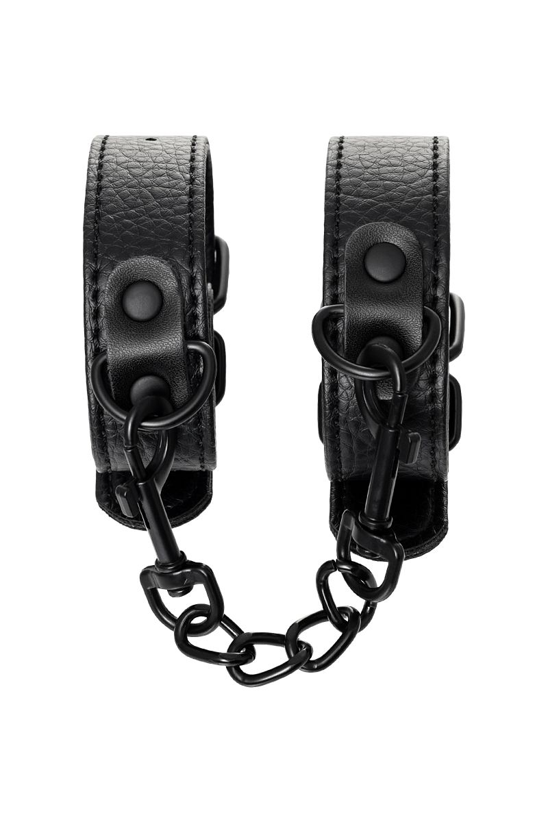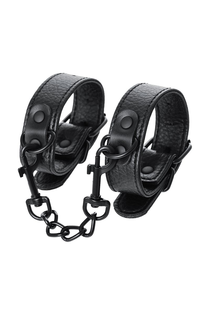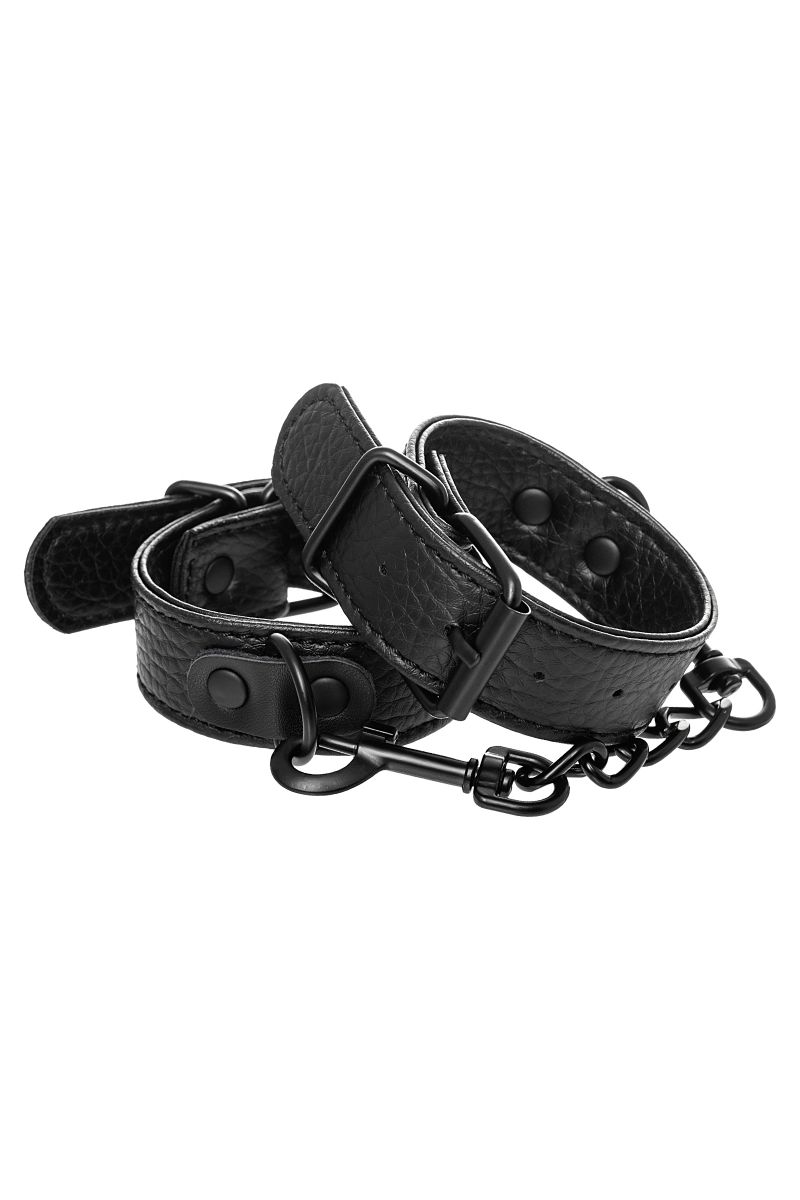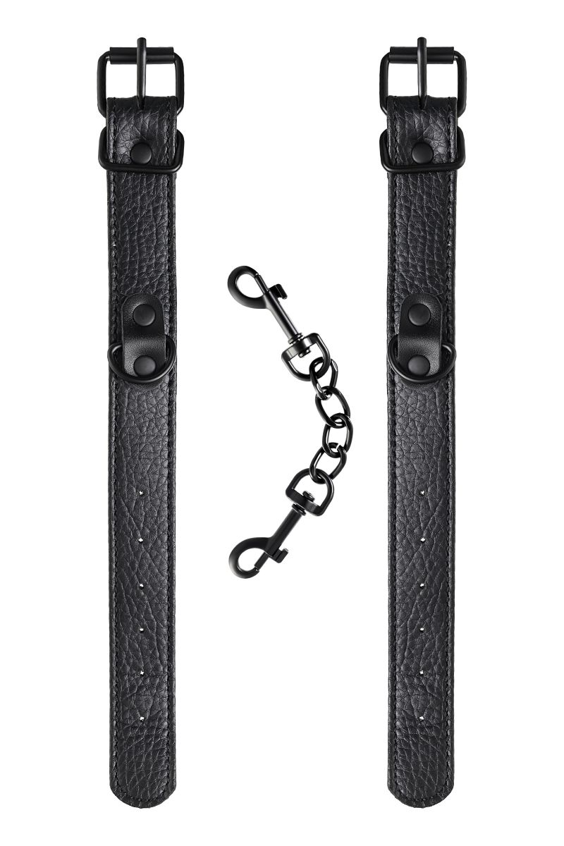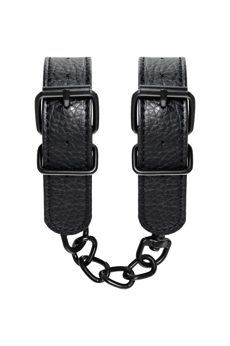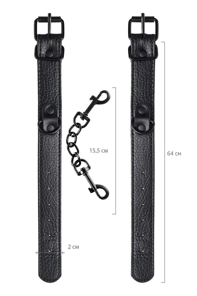 Эти аккуратные наручники из черной PU-кожи с черной же цепочкой-сцепкой нельзя назвать просто ограничителями свободы. Вся металлическая фурнитура выдержана в стиле строгого подчинения, не отвлекая внимание от игрового процесса. Они станут для вас стильным аксессуаром и дополнят любой образ. Благодаря универсальным цвету и форме, они подойдет партнеру любого пола. Фиксируйте руки перед собой или за спиной, развивайте степень своего доверия к Мастеру и свои скрытые желания. Длина манжет - 26,5 см., ширина - 2,5 см. Длина сцепки - 15,5 см.