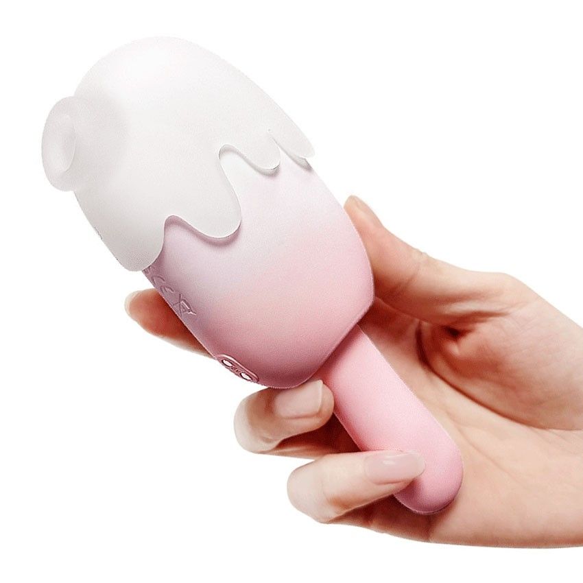 Вибромассажёр в виде аппетитного мороженного придётся по вкусу любителям оригинальных секс-гаджетов. Её «вкусный» дизайн в сочетании с разнообразными режимами вибрации, пульсации и всасывания подарят как эстетическое, так и эротическое удовольствие. Интимный аксессуар может использоваться для прелюдии или усилить удовольствие во время близости. Вибрация ощущается по всей поверхности изделия. «Палочка» двигается в разные стороны, расширяя возможности её применения. Съёмная силиконовая насадка имеет отверстие, через которое чувствуется одновременно пульсация и посасывание. Если убрать насадку, то будет ощущаться только пульсация. Секс-игрушка изготовлена из мягкого приятного на ощупь материала. Проста в использовании и уходе. Управление вибрацией: Включение/выключение изделия: нажать и несколько секунд удерживать соответствующую кнопку на корпусе гаджета. Должен загореться/погаснуть световой индикатор и прозвучать звуковой сигнал. Переключение режимов вибрации: краткое нажатие той же кнопки. Управление режимом пульсации/всасывания: Включение/выключение изделия: нажать и несколько секунд удерживать соответствующую кнопку на корпусе гаджета. Должен загореться/погаснуть световой индикатор и прозвучать звуковой сигнал. Переключение режимов пульсации/всасывания: краткое нажатие той же кнопки. Рабочая длина - 5,4 см.